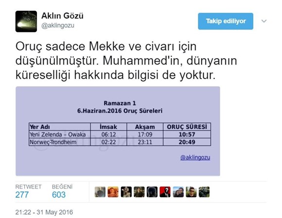 Japon bilim adamları orucun saglikli oldugunu tespit etmiş gibi yalanlar soyler bazi müslümanlar. Bu tamamen yalandır. Saglikli olan tıbbi oruçtur. Vucud max 8 saat ac birakilir ve o esnada bol bol su icilmesi gerekir. Dini oruç ise,15-17 saat ac kalmak daha sonra tıka basa karın doyurmaktir. Bu manyakliktan başka bir sey degildir ve vucudun ölümle dans etmesidir.