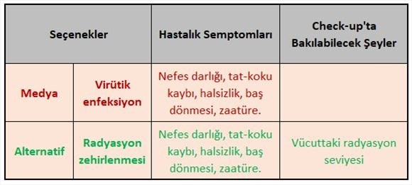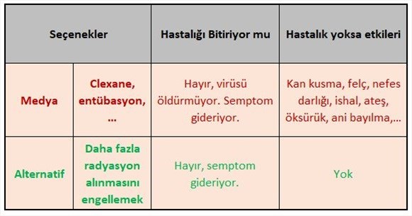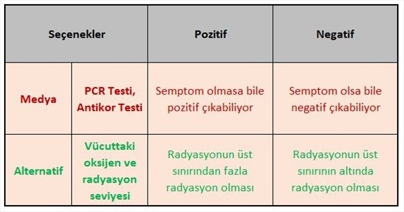 şimdi gelin bu wuhan illeti konusunda, kasım 2020 itibariyle, bu üç aşamanın nasıl işlediğine bakalım. bu kısımla ilgili size tablolar hazırladım. her bir tabloda; bize medya ve yöneticiler tarafından pompalanan seçenek, ve benim kafama yatan en olası alternatifi koyacağım (radyasyon). size demiyorum ki "alternatif gerçek olandır, doğrudur", dediğim gibi bana en olası gelenle kıyasladım. tek amacınız medya kolpasını çözmekse, o kısımlara bakmanıza gerek bile yok.
